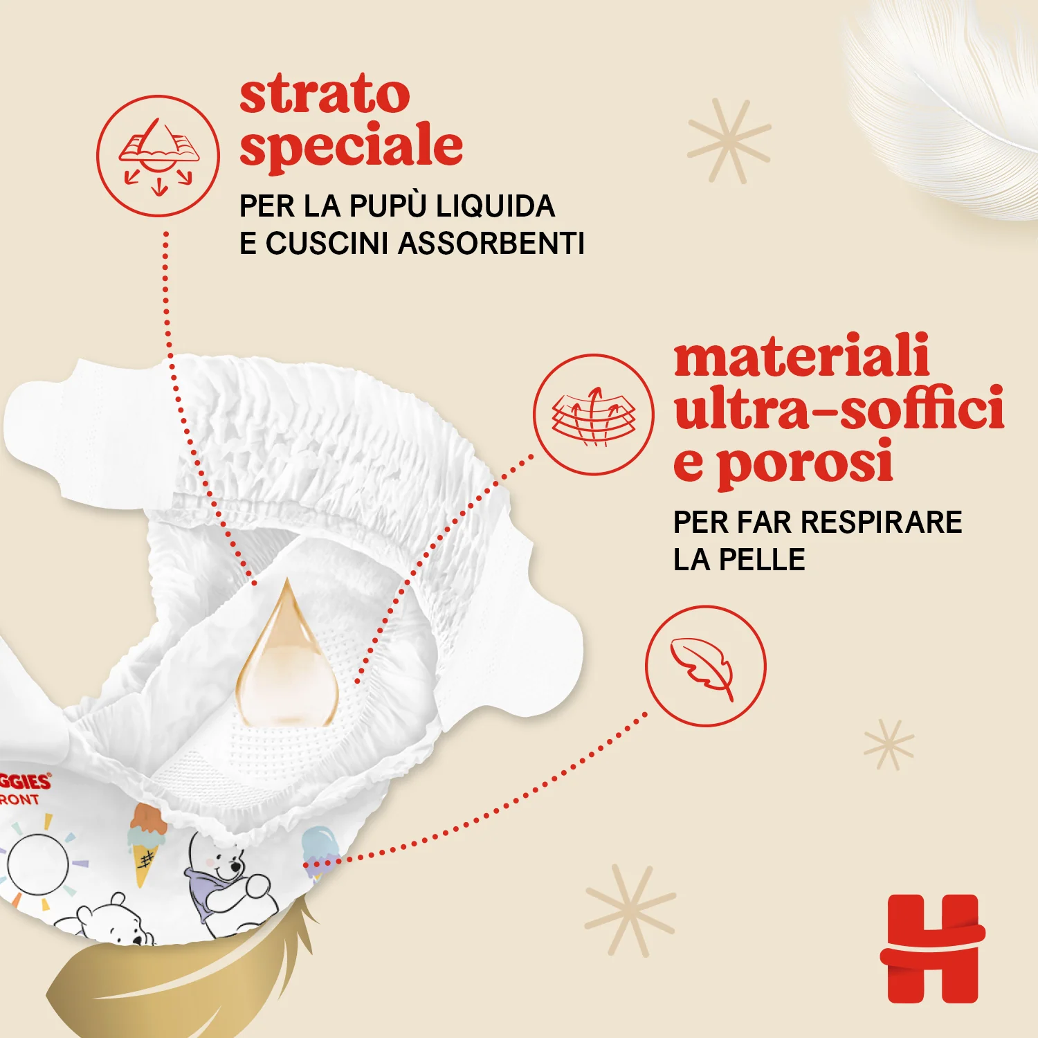 Noi di Huggies pensiamo al tuo bimbo e alla protezione di cui ha bisogno fin dal primo momento. Huggies® Extra Care assorbe la pupù liquida grazie agli esclusivi cuscinetti. La capiente tasca posteriore e le doppie barriere, posizionate sulle gambe, aiutano ad evitare le fuoriuscite. Ipoallergenico e dermatologicamente testato per offrire la massima protezione alla pelle delicatissima del tuo bambino.